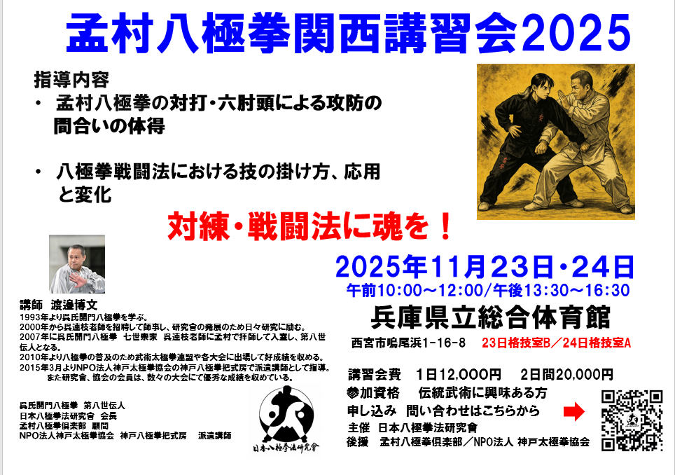 このたび、皆様のご支援のもと「孟村八極拳関西講習会2025」を開催する運びとなりました。
